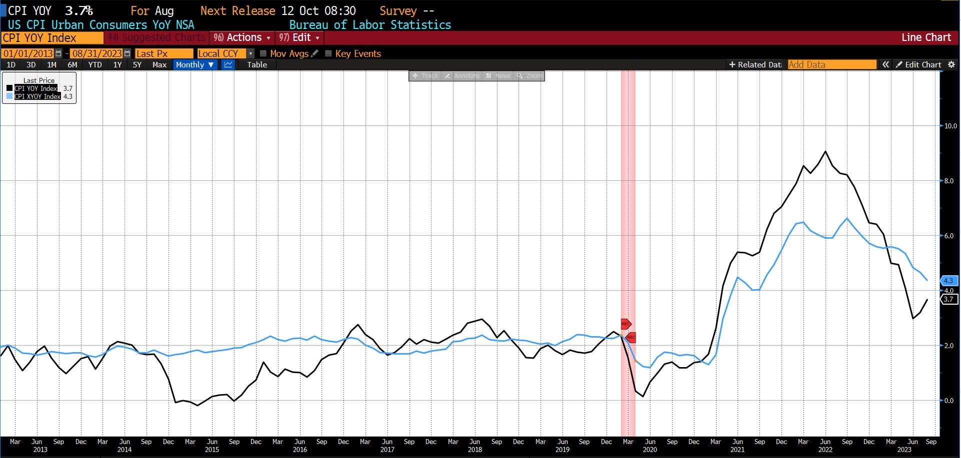 August 2023 US CPI headline & core, year-over-year (2013 – present)