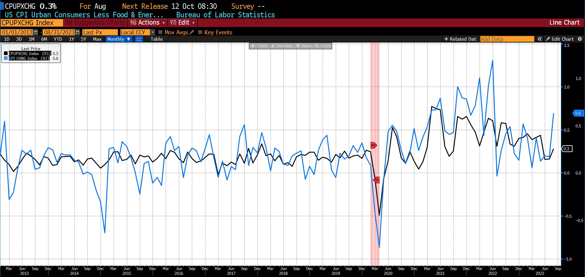 August 2023 US CPI headline & core, month-over-month (2013 – present)
