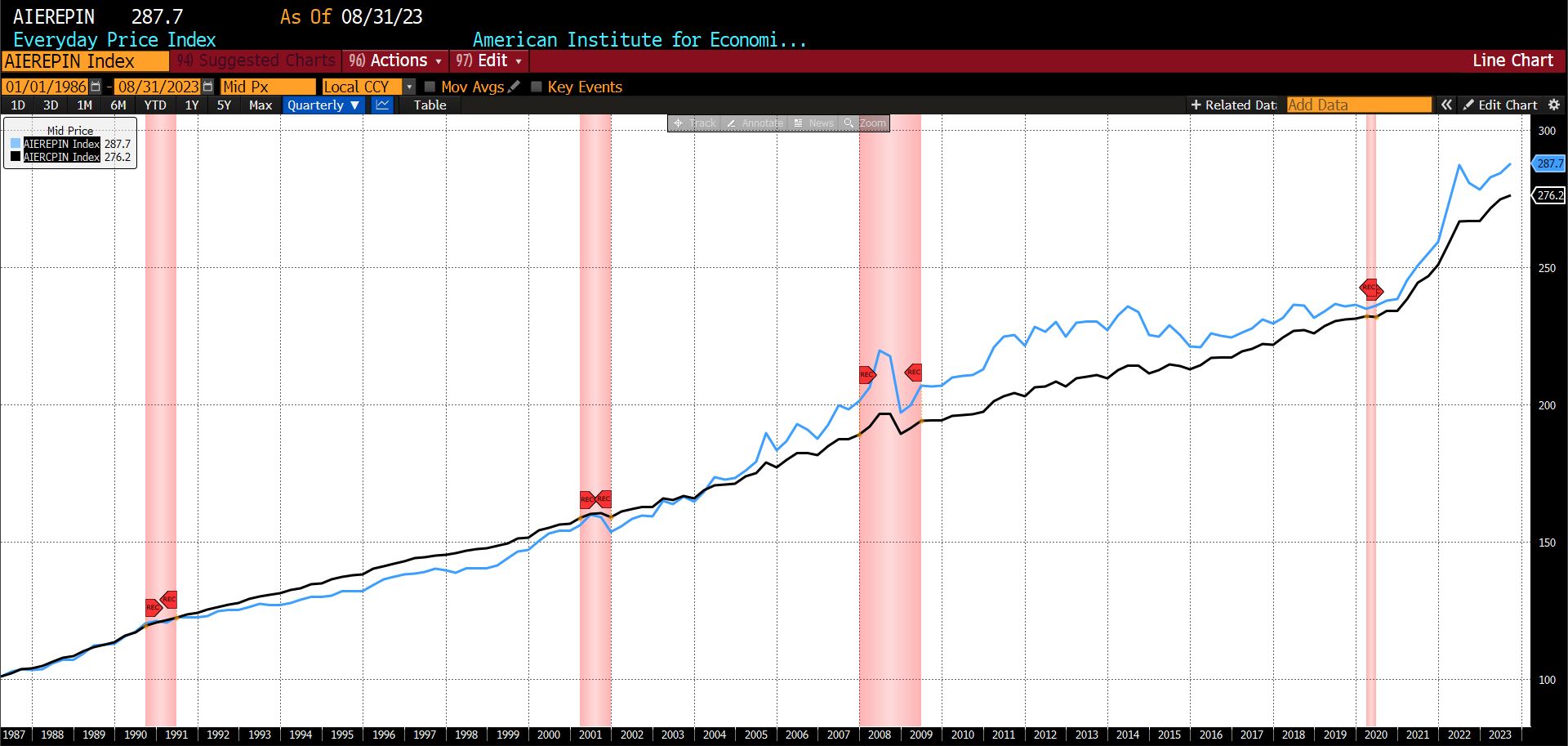 AIER Everyday Price Index vs. US Consumer Price Index (NSA, 1987 = 100)