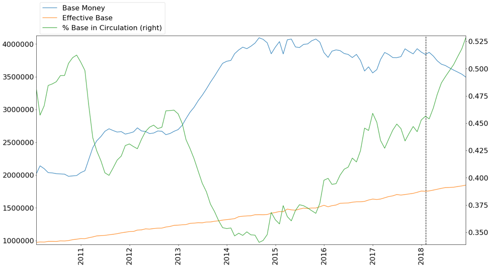 So long as the real rate of economic growth continues to increase, Powell can safely continue to increase the rate of interest paid on excess reserves. Stability in the growth rate of the stock of effective base money suggests that increases in the rate of interest have so far been justified as they have not led to an increase in the quantity of base money collecting interest as excess reserves. Both the proportion of the base and the actual quantity of base money collecting interest as excess reserves have fallen as interest rates have increased under the leadership of Powell.