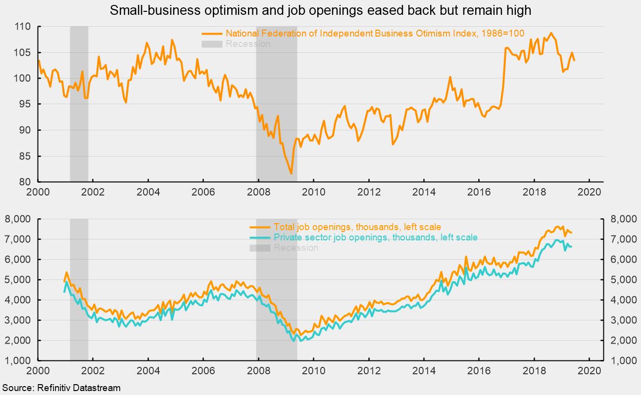 The small-business-optimism index from the National Federation of Independent Business fell to 103.3 in June, down 1.7 points from 105.0 in May and 5.5 points below the all-time high of 108.8 in August 2018. Since first crossing the 100 level, the index has averaged 105.2 and extends a run of 31 consecutive months above 100, a very high figure by historical comparison (see top chart). The small drop in the latest month was primarily reflecting increased uncertainty, a decline in capital spending, higher prices due to compensation pressures and tariffs, and softening of sales expectations. The single most important problem among small businesses remains the declining quality of the available labor force, particularly in the context of an already-tight labor market and the very high percentage of firms with open jobs. The report boldly claims “Main Street is strong.”