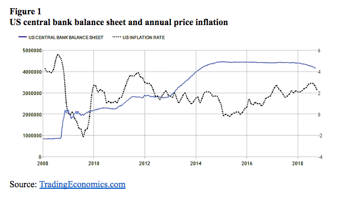 In 1914, the United States installed a central bank. The European countries abandoned the gold standard shortly thereafter. Since then, the world economy has experienced phases of hyperinflation, depression, and stagflation. There have also been times, as in the 1920s and the 1960s, when the price inflation was relatively mild even while the economy was booming. These periods, however, typically have ended in a bust. Over the past 10 years, the major economies have likewise experienced a phase of low, stable inflation. Price inflation has not materialized despite a massive monetary expansion. While the balance sheet of the American central bank increased from under $1 trillion to over $4 trillion, the price inflation rate remained relatively constant at around 2 percent (figure 1).