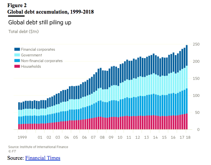 In the 1920s, the monetary authorities misinterpreted price-level stability as an indication that their monetary policy was not excessively expansionary. This also seems to be currently the case. When the central bank targets a certain rate of inflation, it inadvertently creates too much money when the economy’s productive capacity increases and thus would require a falling price level. Thus the central bankers fabricate monetary overexpansion and interest rates that are below the free market equilibrium. This policy moves the economy to ever-higher levels of debt (figure 2).